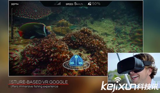 而當我們接入頭戴VR設備后,就能夠體驗身臨其境的水中航行,零距離觀看釣魚的整個過程。VR設備可以通過重力感應控制PowerRay在水下的運動:通過變換頭部向左、向右、向上、向下的姿勢控制PowerRay實現左轉、右轉、上浮、下潛的功能。