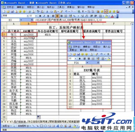 “=VLOOKUP(用戶映射表!A3,ERP賬號表!$A$3:$B$11,2,0)”,意思即為, 在“ERP賬號表”的A3至B11區域中,查找“用戶映射表”的A3格數據,如匹配,則將“ERP賬號表”中的第二列(即B列)的數據,拷貝至B3表格中。由于在公式中的“用戶映射表!A3”采用相對值,所以,選中B3列,向下拉動鼠標在數據區拖拉填充公式即可。