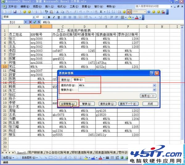 最后,我們只需對“用戶映射表”稍作修改即可。復制“用戶映射表”數據,在新建的工作表中,右鍵單擊,選擇“選擇性粘貼”,在彈出的窗口中,選擇“數值”,確定后便只留下數值,而剔除了所有的公式,接著按下快捷鍵Ctrl+F,彈出“查找和替換”窗口,切換至“替換”選項卡,在“查找內容”欄中輸入#N/A,保持“替換為”欄為空(圖3),單擊“全部替換”,得到最終結果(圖4)。