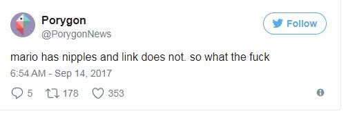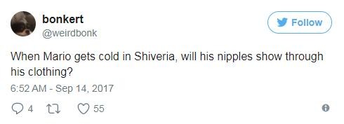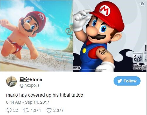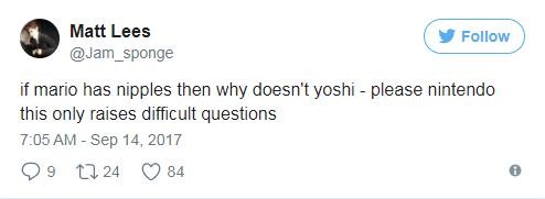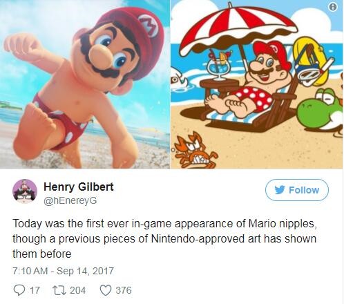 早上任天堂的直面會(huì)中公布了不少馬里奧相關(guān)作品的消息,但玩家們對于這個(gè)水管工的注意力卻集中在了《超級馬里奧:奧德賽》演示中馬里奧赤裸上身的畫面上。為什么呢?因?yàn)榇蠹覍︸R里奧的乳頭更感興趣。因?yàn)檫@張圖,網(wǎng)絡(luò)上已經(jīng)開始了瘋狂地調(diào)侃。
