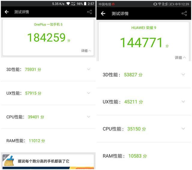 (左:一加5 | “3DMark |“ 右:榮耀9)