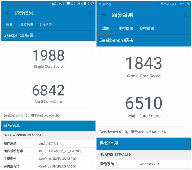 (左:一加5 | “Geekbench” | 右:榮耀9)