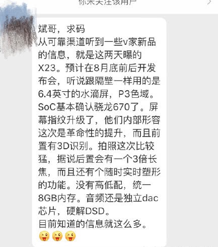 其他配置方面,vivo X23會(huì)搭載驍龍670處理器、屏幕指紋,據(jù)悉屏幕指紋會(huì)有較大升級(jí),或許APEX的半屏指紋。另外,vivo X23或?qū)⒉捎每刹蹲?D深度的TOF后置相機(jī)、并支持3X光學(xué)變焦,拍照能力無疑會(huì)進(jìn)一步提升。