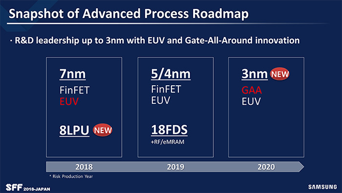 三星電子4日在日本舉行“三星晶圓代工論壇2018日本會議”,簡稱SFF Japan 2018,這是三星第二次在日本舉行代工會議,日本PCwatch網站介紹了三星這次會議的主要內容,三星的口號是“最受信任的代工廠”,并公布了三星在晶圓代工上的最新路線圖。