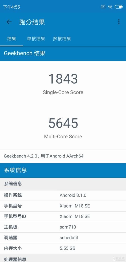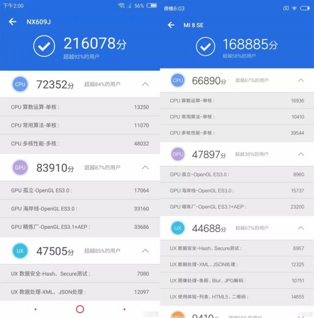 小米6S的Geekbench單核跑分為1830分,搭載驍龍710的小米8 SE單核跑分1843分,兩者幾乎相當。小米6S的Geekbench多核跑分為6944分,小米8 SE多核跑分5645分,多核跑分小米6S大幅超越了小米8 SE。綜合來看,小米6S的的處理器運算能力比小米8 SE更加強大。
