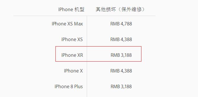 而至于“其他損壞”的維修價(jià)格就更高了,iPhone XR的部分是3188元,同樣為在iPhone X 4388元之下,跟iPhone 8Plus的其他損壞維修價(jià)格相同。