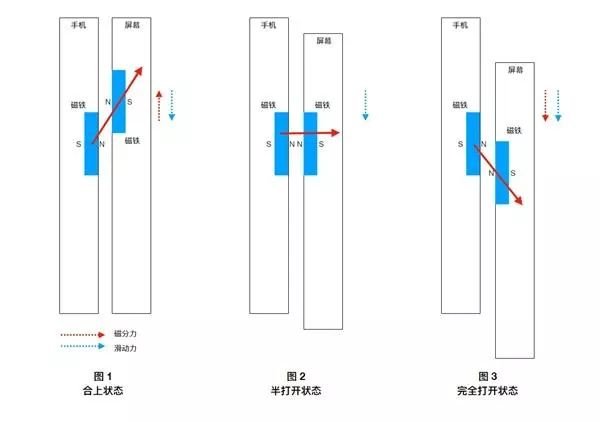 小米MIX 3用稀土永磁鐵組替代了傳統的彈簧結構,將磁鐵的磁力轉化為機械力,通過磁鐵“同極相斥”的特性為屏幕提供上滑的回彈力,以及在滑動過程中的阻尼感。