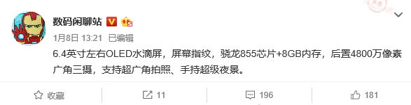 綜合以上國內外爆料者信息可知:小米9將采用6.4英寸OLED水滴屏,搭載高通驍龍855處理器,后置4800萬像素廣角三攝,提供8GB大內存版本,支持屏幕指紋識別,以及充電更快的QC 5.0快充。