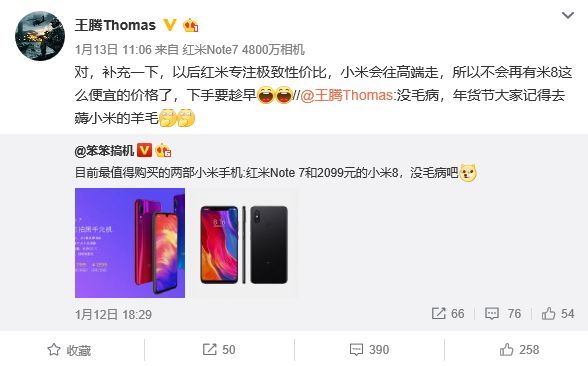 最近,雷軍在微博上透露,紅米未來將發布驍龍855旗艦,價格在2500元檔位。這個價位與小米8發布時售價很接近,意味著作為小米旗艦機的小米9顯然要高于2500元。值得一提的是,小米公司產品總監王騰也近日表示,小米品牌以后會往高端走,不會再有小米8這樣便宜的價格。