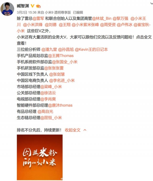 另外,從“生死看淡,不服就干”開始,小米的營(yíng)銷策略也在今年發(fā)生了很大的改變,簡(jiǎn)單概括一下就是“全員 KOL 化”,上至雷軍、林斌,下至部門總經(jīng)理,全員上陣進(jìn)行社會(huì)化(主要是微博)營(yíng)銷,人均“大V”。這讓小米在微博上有了極高的聲量,在出現(xiàn)一些爭(zhēng)議話題(比如“真假” 4800 萬(wàn)像素)時(shí),官方親自下場(chǎng),炒起熱度。