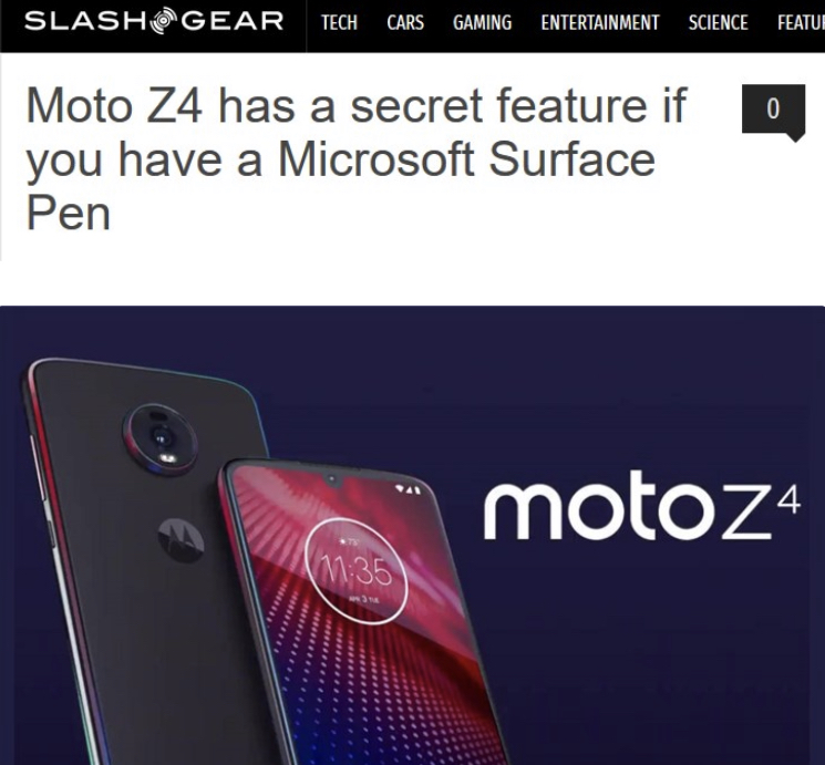 據(jù)Slash Gear報道,早在之前的摩托羅拉Moto Z4海報上,一些眼尖的人發(fā)現(xiàn)摩托羅拉的產(chǎn)品頁面曾提到過對手寫筆的支持。更重要的是,它提到了與微軟Surface觸控筆協(xié)議的兼容性。有人嘗試使用微軟Surface觸控筆,發(fā)現(xiàn)可以工作。