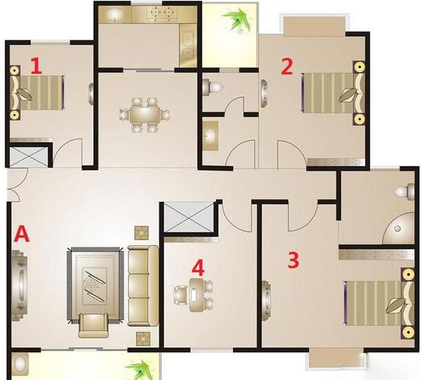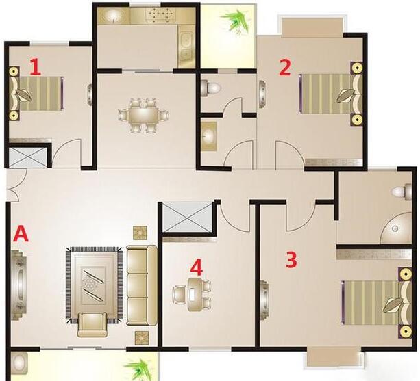 在戶型圖中,黑色的實線都是承重墻。所以,要想家中的無線網絡信號最強,3臺無線路由器的最佳擺放位置分別是:臥室1、臥室2和臥室4。