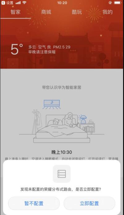 第一步:將主路由放置在臥室1,并將光貓與主路由連接后,直接通電。掃描分布式路由包裝上的二維碼,安裝“華為智能家居”APP,然后系統會彈出配置。