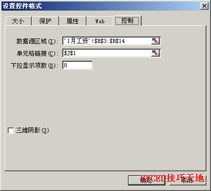 在“設置控件格式”對話框中選擇“控制”選項卡,設置“數據源”區域為“'1月工資'!$B$3:$B$14”(或“姓名”),設置“單元格鏈接”為$J$1,如圖。