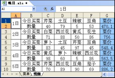如圖1和圖2所示,“菜單”工作表中是常購菜名與單價,“明細”工作表是每日購買的菜名與數量,每日四種菜,菜名與數量各占一行,G列是需要計算的結果。