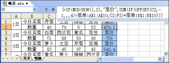 公式解釋:MOD函數是用來返回兩數相除的余數,ROW函數用于返回當前行的行號。在本例中MOD配合ROW函數可用于判斷公式所在行的奇偶性。對奇數行,公式返回結果“菜單”,而偶數行則返回當日的購菜總價。
