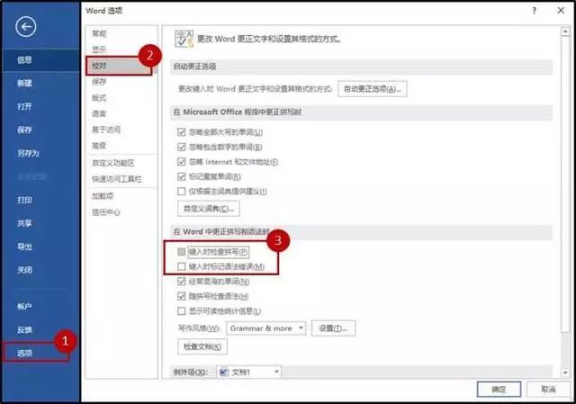 【文件】-【選項(xiàng)】-【校對】,取消勾選“鍵入時檢查拼寫”和“鍵入時標(biāo)記語法錯誤”。
