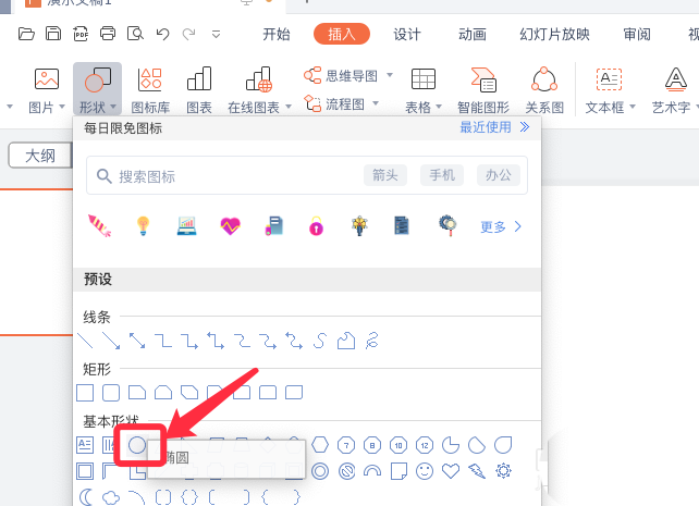 1、點(diǎn)擊插入,形狀,插入一個(gè)圓形。