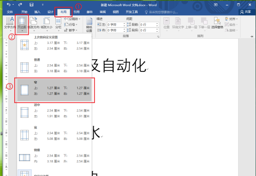 2、依次點(diǎn)擊【布局】選項(xiàng)卡>>【頁(yè)邊距】,在彈出的選項(xiàng)中點(diǎn)擊【窄】。