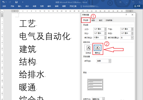 4、點(diǎn)擊【頁(yè)邊距】,紙張方向選擇“橫向”。