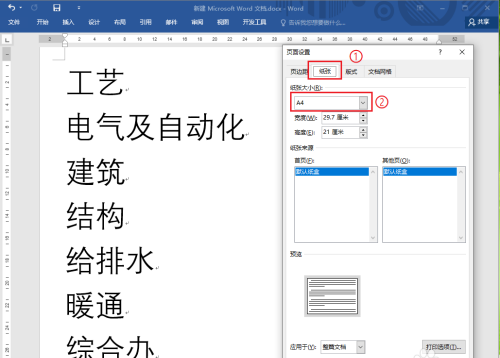 5、點(diǎn)擊【紙張】,選擇合適的紙張大小,例如“A4”。