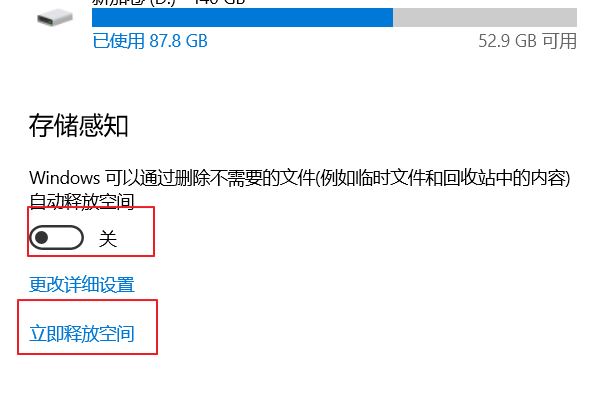 4、將存儲感知的開關打開,再點擊【立即釋百放空間】。