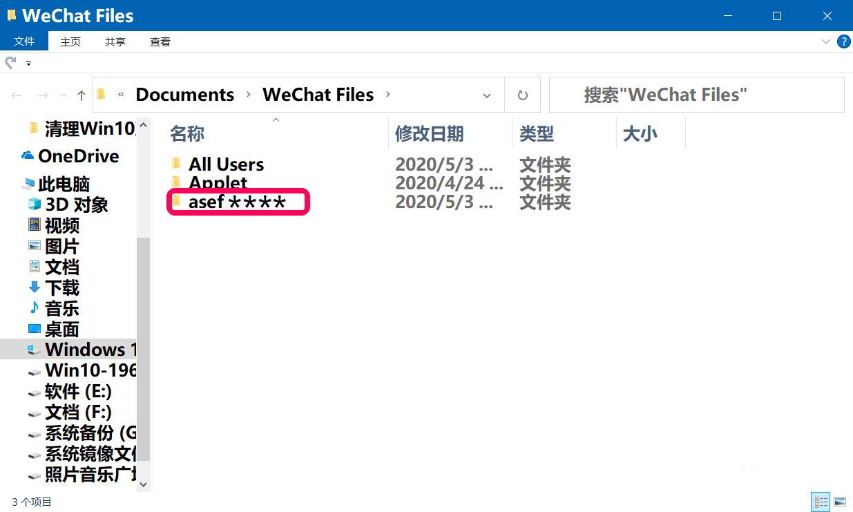 2、在打開的 WeChat Files 文件夾窗口中,我們可以看到登錄使用過的微信號:asef**** ;