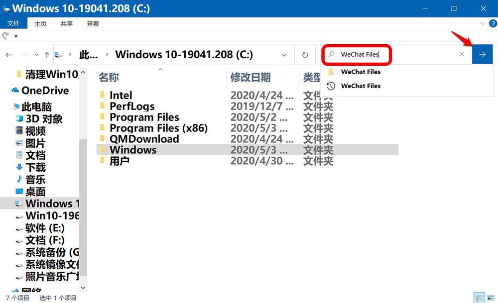 2、在搜索欄中輸入 WeChat Files ,點擊箭頭或按下鍵盤上的回車鍵;
