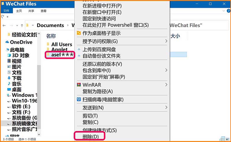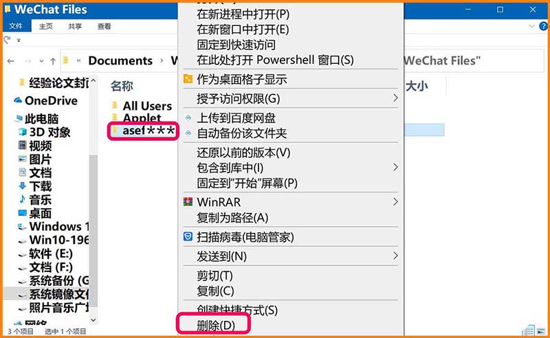 3、右鍵點擊 asef**** 微信號文件夾,在右鍵菜單中點擊:刪除。