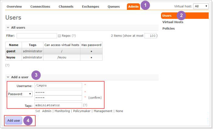 現在,您將需要為RabbitMQ Web管理控制臺創建管理用戶。 運行以下命令相同。