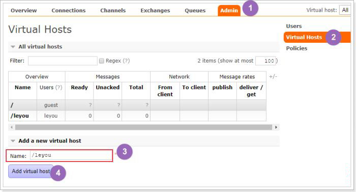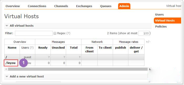 為了讓各個用戶可以互不干擾的工作,RabbitMQ添加了虛擬主機(Virtual Hosts)的概念。其實就是一個獨立的訪問路徑,不同用戶使用不同路徑,各自有自己的隊列、交換機,互相不會影響。