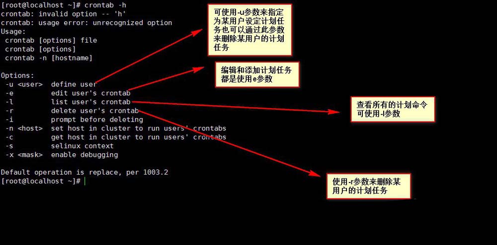 4、crond服務(wù)提供crontab命令設(shè)置計(jì)劃任務(wù),crontab命令可通過(guò)-h命令來(lái)查看一些參數(shù)信息