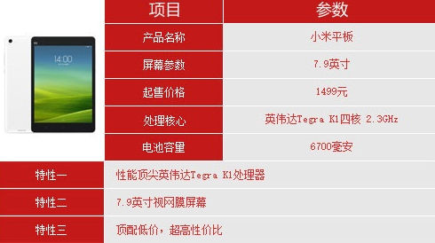 小米平板是一款發(fā)燒神器,采用7.9英寸視網(wǎng)膜屏,搭載Tegra K1處理器,四個(gè)2.2GHz A15核心和一個(gè)A15省電核心架構(gòu)。同時(shí)配備192核GPU,圖形處理性能是蘋(píng)果A7的2.3倍前,內(nèi)置2GB運(yùn)行內(nèi)存及6700毫安時(shí)大電池,最低售價(jià)僅1499元,大型3D游戲完全不在話下。