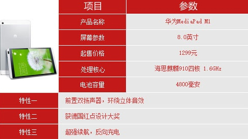 華為MediaPad M1市場(chǎng)定位很清晰,不去跟小米拼性價(jià)比,采用雙前置立體環(huán)繞音響,主打娛樂(lè)影音體驗(yàn),觀影體驗(yàn)十分不錯(cuò)。華為M1配置足夠用,搭載1.6GHz的Kirin 910四核處理器,1GB運(yùn)行內(nèi)存,8GB存儲(chǔ)空間,售價(jià)1299元。