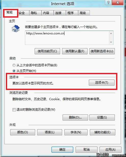 3、在打開的IE選項卡中的常規選項卡中找到并單擊“選項卡”按扭。
