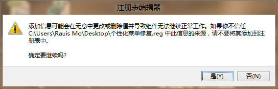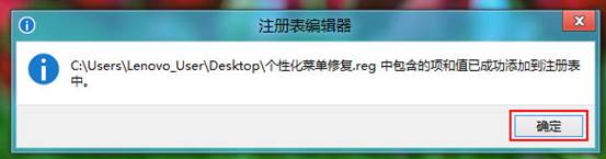 1、下載附件提供的“個性化菜單修復.reg”至桌面,然后使用鼠標左鍵雙擊運行。如下圖所示: