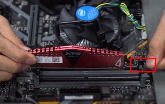 電腦內存條也是有防呆缺口的,我們將內存防呆缺口的,反了是插不進去的,將內存正確插入。