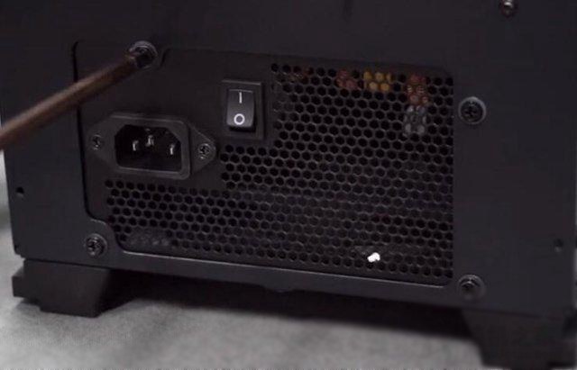由于我們這款機箱是下置電源,我們安裝電源的時候,將電源的風扇的位置往下進行安裝,如下圖所示。
