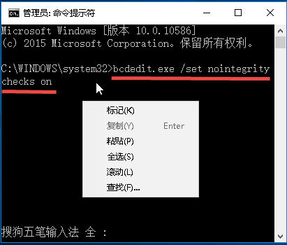 2、在CMD窗口中,輸入bcdedit.exe/setnointegritycheckson 可以復制后在CDM窗口內右擊選擇粘貼。