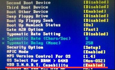 3、然后將光標移至下方的“HDD S.M.A.R.T. Capability”,同樣按Enter鍵打開設置窗口,選擇“Enabled”,按Enter鍵確定,如圖所示: