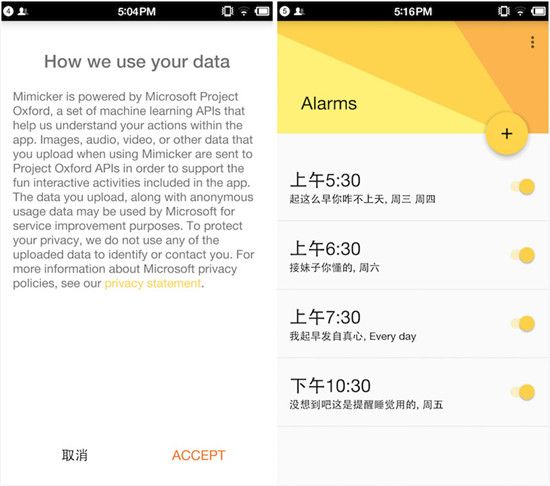 Mimicker Alarm 首先給出了一則聲明,旨在告訴用戶其使用鬧鐘的行為數據會被采集并用來研究和改進服務。Mimicker Alarm 完全采用 Material Design 設計范式,簡單有質感。
