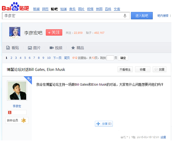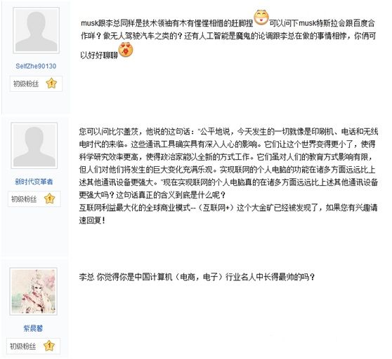 胸懷大志也好,文理雙全也好,這兩位能夠通過李彥宏直接與比爾.蓋茨和馬斯克對話的吧友,還有那些也對科技巨頭們提出了問題,但一時未能如愿的吧友,他們共同的身份都是:普普通通的貼吧吧友。在半個月前,李彥宏在自己的吧里發出了將于蓋茨和馬斯克對話的預告,并向吧友們征集問題,一時間,這些普通的吧友都紛紛表現出了自己“不普通”的一面,各種五花八門的問題令人應接不暇。其中許多問題在內涵和深度上,已經不輸給業界專家了。當然,也有一些亂入的問題……