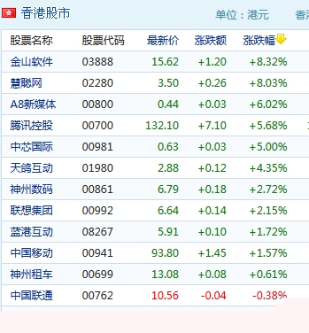 8月25日上午消息,港股周二早盤全線反彈,截至10:30,港股恒生指數上漲2.15%。金山軟件和慧聰網漲幅均超8%,前者上漲8.32%,后者上漲8.03%。