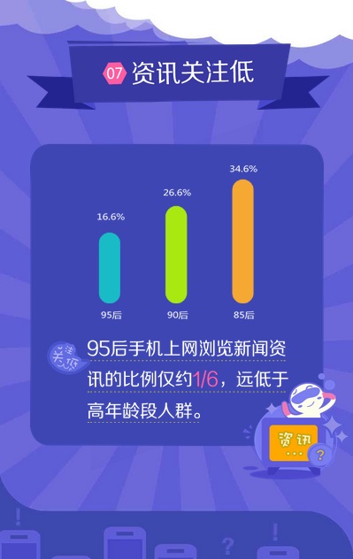 95后,即1995-1999年出生、年齡16-20歲、處于青春期末期的人群,人口總量約1億,在人口中占比不到10%,卻是移動互聯網用戶中占比最高的人群,他們是移動互聯網的原住民,移動搜索的主力用戶。隨著年齡增長95后正在迅速崛起,是未來幾年移動消費的主力用戶群體。