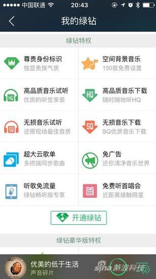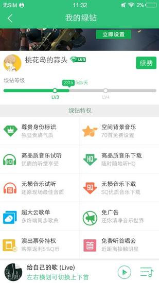 音質方面,開通綠鉆以后,可以試聽以及下載320以及無損音樂。