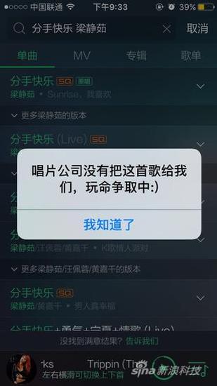 說完界面我們來說內容,小編剛結束了一段4年的感情,本想來聽聽音樂釋放下感情,搜索《分手快樂》,看到提示“唱片公司沒有把這首歌給我們,玩命爭取中:)”。《盛夏的果實》,看到提示“唱片公司沒有把這首歌給我們,玩命爭取中:)”。《你不會》看到提示“唱片公司沒有把這首歌給我們,玩命爭取中:)”。