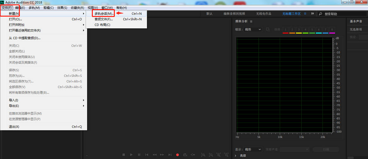 1、首先在電腦中打開AU軟件,點擊頂部工具欄中的“新建”——“文件”——“多軌會話”。