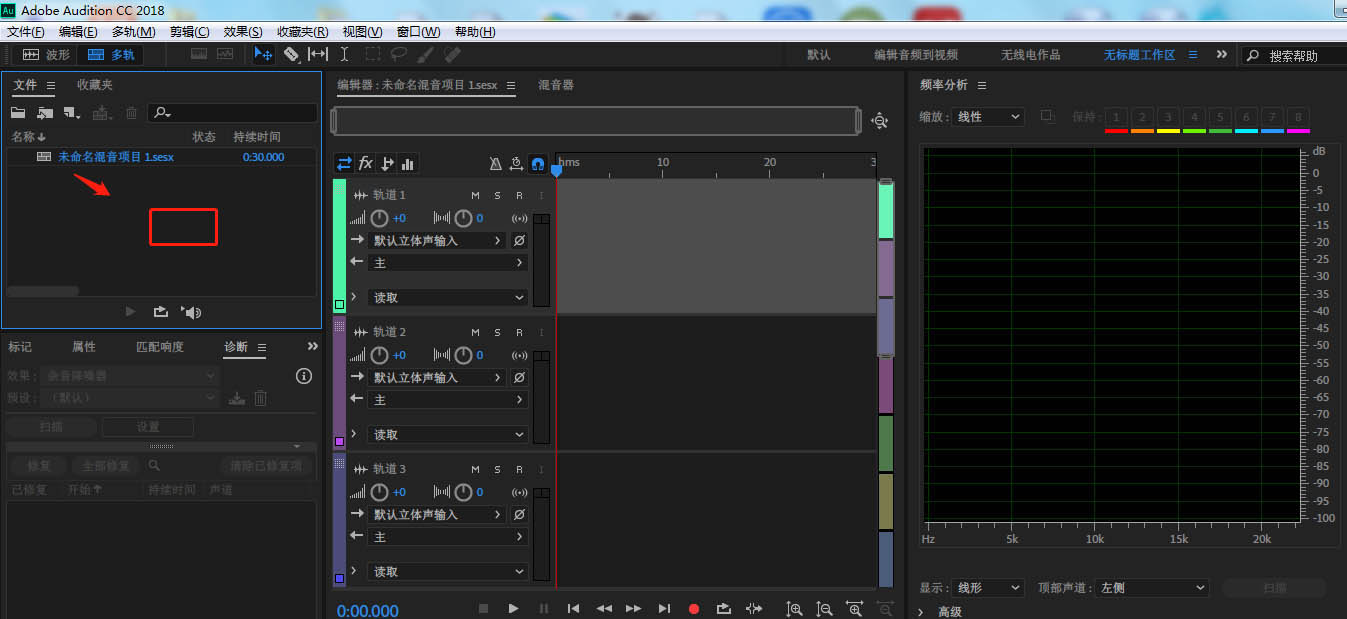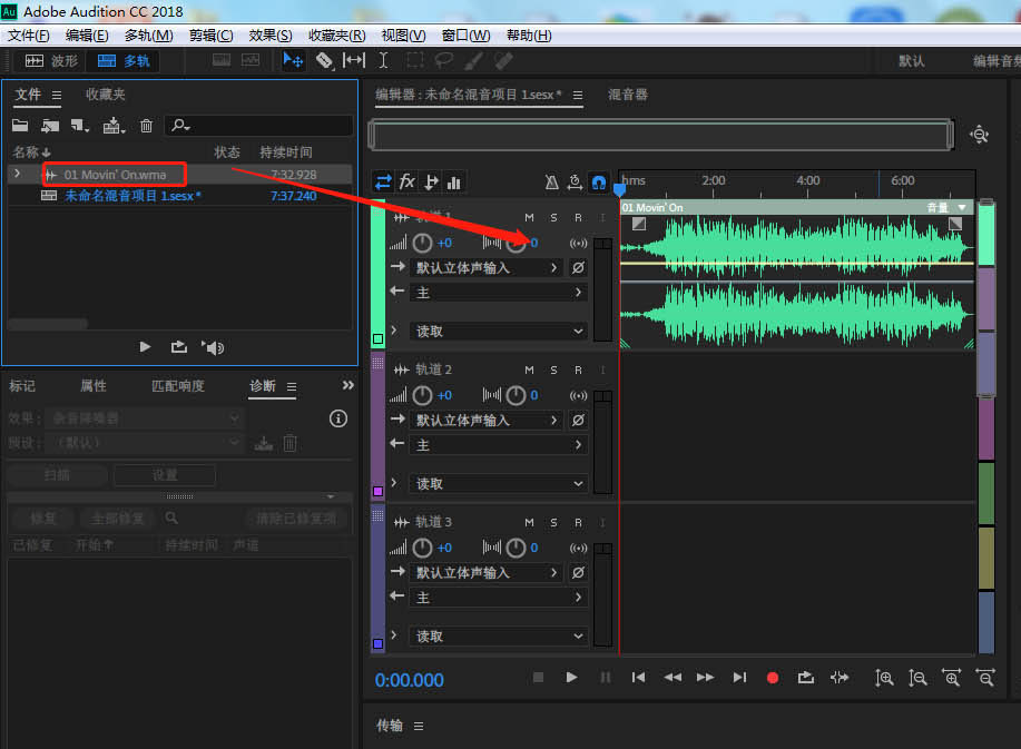 3、在軟件中將左側導入的音頻素材,拖動至右側的多軌會話當中。