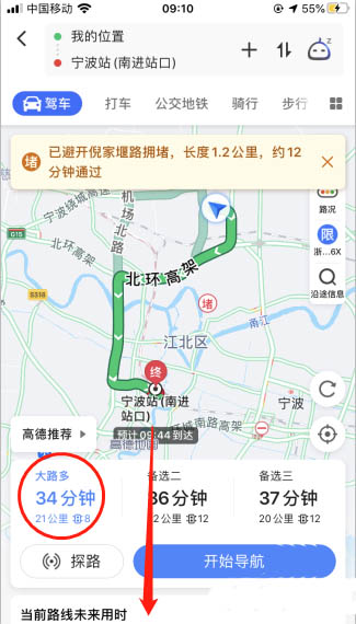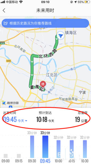 3、我們可以看到現(xiàn)在出發(fā)需要多少時間,屏幕往下拉,有一個未來用時